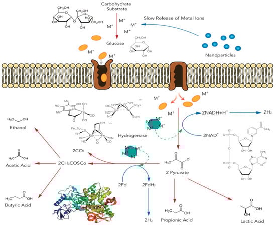 Many extensively studied metal ions and metal-based nanoparticles are regarded as effective additives in culture medium to facilitate BioH2 production in the dark fermentation process, including Na+, K+, NH4+, Mg2+, Ca2+, Co2+, Zn2+, Cu2+, Fe2+/Fe3+, and Ni2+/Ni3+, among others [27,28,29]. Extensive studies have found that even small changes in the latter may have a significant impact on BioH2 production; hence, many strategies have been proposed based on them, such as concentration regulation, including concentration manipulation [30], size regulation [17,31], composites fabrication [23,32], and heteroatom doping [33]. In general, the enhancement of NPs addition lies in a few important facts: (i) the controllable release of mental ions that facilitates the passive transport across the membrane [34]; (ii) nanodots that facilitate the electron transport chain during metabolism, such as glycolysis [35]; and (iii) the appropriate level of NPs favorable to the hydrogenase activities (co-enzymes often contain the metal ions in the catalysis center, which ultimately enhances the rate of hydrogen generation [36]. The potential mechanisms of BioH2 enhancement are summarized in Figure 2. Therefore, in this part, this review will focus on the impact of the latter on BioH2 production and its mechanisms.