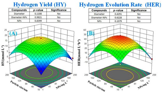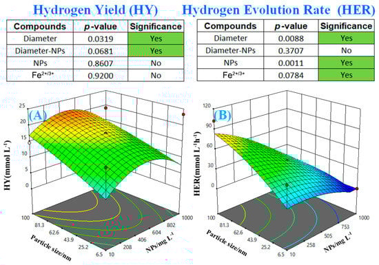Statistical analysis of HY and HER. HY refers to H2 yield; HER refers to the H2 evolution rate. (A) Particle size and NP concentrations versus HY, (B) particle size and NP concentrations versus HER.