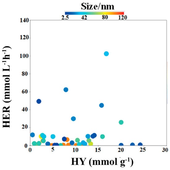 The addition of NPs was found to be effective at improving BioH2 generation due to the fact that NPs can facilitate electron transport in extracellular cultivation medium during fermentation [66,67]. With regard to the HY and HER, it was quite hard to find one individual NPs that positively enhanced both HY and HER simultaneously. This reflects the complex features of the BioH2 generation process, which generally involves many different steps of sub-metabolic pathways [43,68]. Among the investigated collected literature, CoO-NPs addition was among the most appreciable enhancement for HY and Ag-NPs addition was the most influential factor for HER enhancement. In addition, the impact of adding NPs prepared from hybrid approaches such as combining two different kinds of NPs, i.e., Cu and SiO2, was marginal. The correlation between BioH2 generation values (HER and HY) and the corresponding size of the NPs added to the fermentation broth was constructed and is plotted in Figure 5. The corresponding HY and HER varied from 0–30 (mmol g−1) and 0–80 (mmol L−1 h−1), respectively. Regarding to the enhancement of HY, some reported that smaller size (less than 42 nm) surely increased HY from 10 to 20–25 mmol g−1. On the other hand, for the enhancement of HER, some reported that a relatively bigger size of 40–50 nm seemed to significantly increase the H2 evolution rate. However, by considering the numbers of reports, the majority of works showed (i) the size of NPs seems to be more effective in enhancing HY than HER, and (ii) the rate of H2 evolution seems to be less responsive to the size of NPs, though some literature reported exceptionally higher values of HER after NPs (40–50 nm) addition.