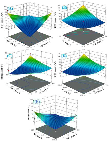 ANNs-RSM analysis of statically significant ion concentrations for HER. (A) Mg2+/Cu2+ nanoparticle concentration versus HER, (B) Na+/Mg2+ nanoparticle concentration versus HER, (C) Na+/NH4+ nanoparticle concentration versus HER, (D) Na+/K+ nanoparticle concentration versus HER, (E) NH4+/K+ nanoparticle concentration versus HER.