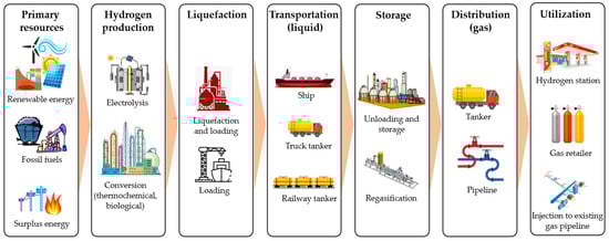 Figure 1 shows the basic supply chain of liquid hydrogen, covering hydrogen production, liquefaction, transportation, distribution, and utilization. Hydrogen can be produced from various primary energy sources, including conventional fossil fuels, renewable energy sources, and surplus energy (heat and electricity). This conversion can be conducted through electrochemical (electrolysis), thermochemical (gasification, pyrolysis, steam reforming, and chemical looping) [16], and biological processes (fermentation, biophotolysis, and microbial electrolysis) [17]. The produced hydrogen is then liquefied before being loaded for transportation. Various transportation options are available, such as sea tankers, trucks, and railway tankers. Transportation covers long-distance international shipping and domestic distribution. In the utilization sites, liquid hydrogen is unloaded and regasified before being distributed to small sale consumers.