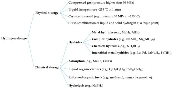 Figure 3 shows some possible hydrogen storage options, including compression, liquefaction, hydrides, and adsorption. In physical storage, hydrogen can be stored through compression and liquefaction in the form of compressed, liquid, cryo-compressed, and slush hydrogen. In addition, chemical storage converts a broad range of materials to bind or react with hydrogen. These include hydrides (metal, interstitial metal, complex, and chemical hydrides), liquid organic hydrogen carriers (LOHC), reformed organic fuels, and hydrolysis. Among these, compression and metal hydrides are considered efficient methods for small- to medium-scale hydrogen storage [24]. Integrating large-scale energy storage into the electrical grid has the potential to solve grid problems, including the fluctuation of renewable energy [25] and storage of surplus energy.