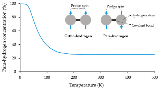 The concentration of ortho- and para-hydrogen depends strongly on the temperature. Particularly at lower temperatures, below −120 °C, the concentration of para-hydrogen increased significantly under equilibrium conditions. There was no significant change in the concentration ratio of both ortho- and para-hydrogen at temperatures higher than −120 °C. Under atmospheric conditions (20 °C and 1 atm), gaseous hydrogen consists of 75 and 25% ortho- and para-hydrogen, respectively [63], and is generally referred to as normal hydrogen. However, when the temperature is cooled to near zero, the concentration of para-hydrogen approaches 100%.