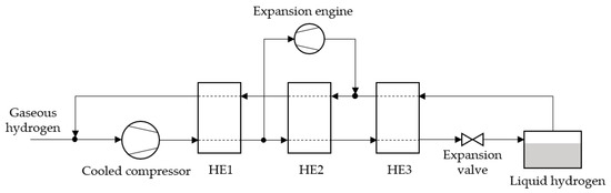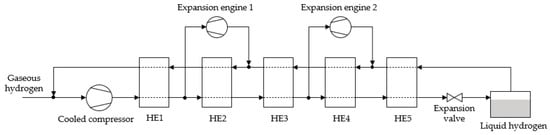 Figure 6 shows a schematic diagram of the Claude process for hydrogen liquefaction [69]. The compressed gaseous hydrogen is cooled through several series of heat exchangers, where an expansion engine is installed between the heat exchangers. A part of the compressed gas is fed to the expansion engine and used to cool the remaining gas. Theoretically, isothermal compression and isenthalpic expansion are employed. The expansion engine cannot practically be used for condensation, as the liquefied substance potentially damages this expansion engine. Using this expansion engine, a part of the high-pressure hydrogen is expanded to generate a lower temperature of hydrogen. Then, it was mixed with cold hydrogen at a low temperature, which was then heat exchanged with the high-pressure hydrogen in the heat exchanger (HE2).