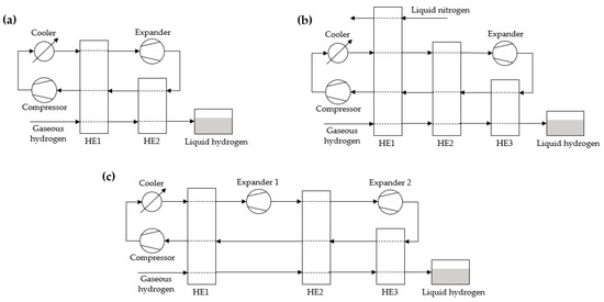 Basic schematic diagram of Brayton cycle for hydrogen liquefaction: (a) simple helium Brayton cycle; (b) helium Brayton cycle with liquid nitrogen pre-cooling, and (c) two-step helium Brayton cycle [67].