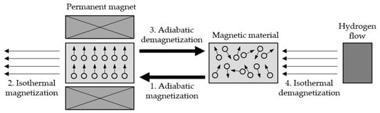 Figure 9 shows a schematic diagram of the magnetic hydrogen liquefaction. Magnetic refrigeration principally adopts the reversed Carnot cycle and consists of four continuous steps: adiabatic magnetization, isothermal magnetization, adiabatic demagnetization, and isothermal demagnetization [76]. In adiabatic magnetization, the working material is installed in a thermally insulated environment. When an external magnetic field is applied and increased, the magnetic atom dipoles are aligned, leading to a decrease in the entropy and heat capacity. Subsequently, the process was continued with isothermal magnetization (isomagnetic enthalpy transfer), where the heat was removed by another fluid, while the magnetic field was kept constant to avoid heat absorption by the dipoles. Furthermore, the working material is placed under adiabatic conditions in adiabatic demagnetization; hence, the total enthalpy remains constant. In this step, as the magnetic field decreases, the generated heat results in magnetic moments overcoming the magnetic field. Therefore, the working material was cooled. The thermal entropy was converted to the magnetic entropy. In the last step, isothermal demagnetization (isomagnetic entropy transfer) is conducted, in which the magnetic field is kept constant to prevent material reheating. In this step, the working material has thermal contact with the hydrogen to be refrigerated or liquefied. As the environment temperature is higher than the working material temperature, heat is transferred to the working material.