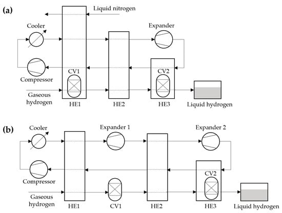 The Hampson–Linde (or Joule–Thomson expansion) process is considered the most basic and simplest liquefaction process [56]. In this process, the hydrogen gas under ambient conditions is compressed and then cooled via heat exchange. Subsequently, the isenthalpic Joule–Thomson expansion for this compressed and cooled gas was conducted through a throttling valve. As the system relies on the Joule–Thomson effect for liquefaction, a high pressure of hydrogen is generally required [67]. A part of the compressed gas becomes liquid, while the rest (which is still in gaseous form) is recirculated back for the subsequent cooling process. This process is appropriate for gas that can be cooled by expansion at room temperature, such as nitrogen. However, hydrogen, such as helium, warms up during expansion at room temperature. Therefore, to cool down the hydrogen following expansion, hydrogen must be initially cooled to its inversion temperature (−73 °C at 1 bar) or lower [68]. Liquid nitrogen (boiling temperature of −195 °C at 1 bar) can be used to pre-cool the hydrogen. It is important to note that the inversion temperature is strongly influenced by the pressure; hence, pressure adjustment is crucial to facilitate sufficient pre-cooling.
