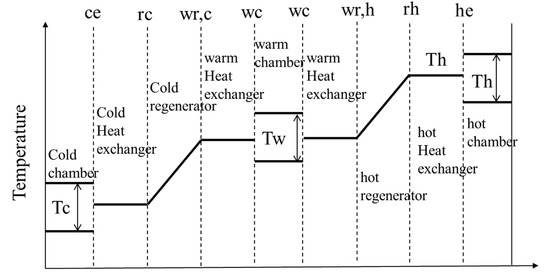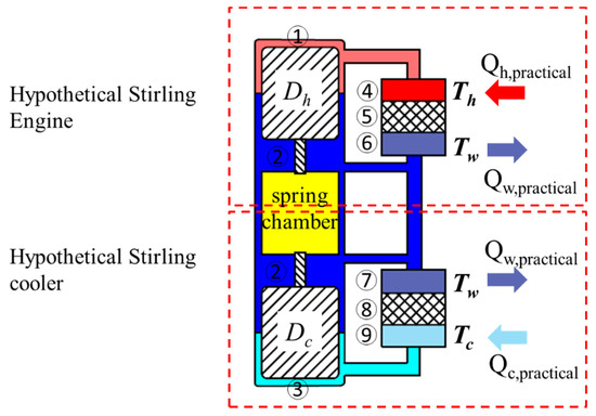- Zou, P.; Gao, Q.; Wang, S.; Yang, J.; Luo, B.; Hofbauer, P.; Liu, J.; Huang, Y.; Ren, C. A method of analyzing the respective performances of hypothetical stirling engine and stirling cooler in Vuilleumier machine. Int. J. Refrig. 2020, 118, 376–383. [Google Scholar] [CrossRef]