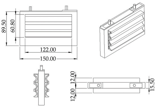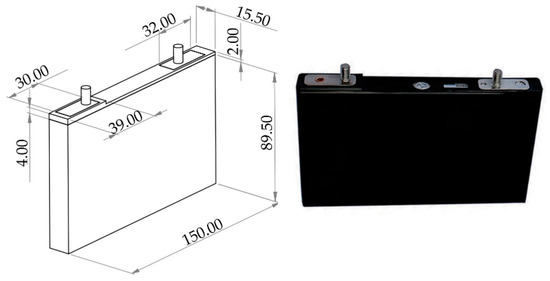 In this study, the target cell is a commercial prismatic LiC cell with 2300 F capacitance. The LiC is a hybrid technology that is categorized between LiBs and EDLCs that has no symmetric structure. The cathode of the LiC is made of porous activated carbon (AC), and the anode is made of carbon with doped li-ion. In addition, Lithium salt is used as an electrolyte. The LiC can be cycled with current rates of up to 300 A for continuous currents and 500 A for pulse currents. Therefore, in this work, a high duty current rate is applied to the cell to extract the cell’s electrical and thermal parameters, which will then be used for the 3D CFD simulation studies. The characteristics of the target LiC cell are shown in Table 1. In addition, the schematic of the cell with all the dimensions is depicted in Figure 1.