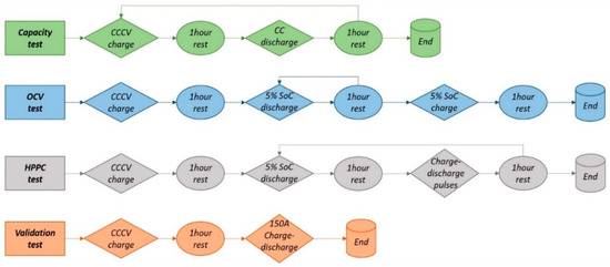 The facilities of the MOBI laboratory in the ETEC department of the Vrije Universiteit Brussel were employed for the experimental tests. In this context, PEC battery tester and cycler were used to characterize and cycle the LiC cell. A climate chamber was employed to keep the temperature at a controlled test condition. K-type thermocouples and a data logger were linked to a computer in each time step to measure the temperature. The test protocol is demonstrated in Figure 2, showing all the tests needed to characterize the cell and extract the electrical and thermal parameters of the LiC. The characterization tests have been carried out within a wide range of temperatures from −30 °C to 60 °C. In addition, the current rates applied to the cell are pretty high, from 0.1 A to 500 A, which shows the work’s uniqueness in the field of electro-thermal modeling.