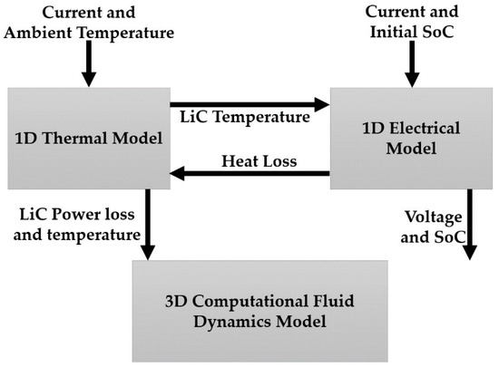 The output of the 1D electro-thermal model used for the 3D model development is the LiC temperature and power loss. The 1D model’s output is linked to the CFD model in this section to make a 1D–3D robust model capable of extracting the electrical and thermal parameters and simulating the CFD model.
