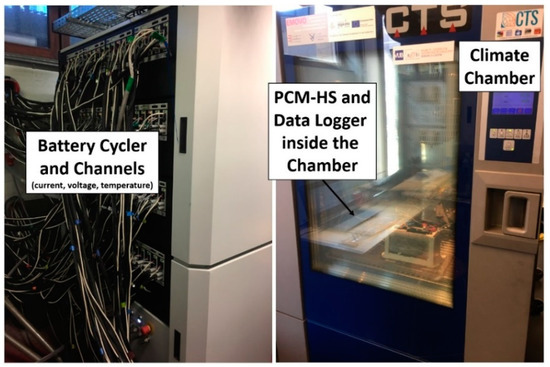 Test bench facilities, including the battery cycler with 80 channels, a climate chamber, a data logger with thermocouples, and the PCM-HS inside the chamber.