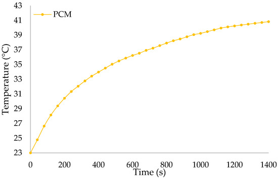 As mentioned earlier, k is the thermal conductivity. In addition, denotes the temperature gradient. At the beginning of the numerical computations (t = 0), the initial condition of is assumed. Hence, the initial and the ambient temperature of 23 °C is set in the CFD simulation studies. The simulation time for the 3D CFD simulation studies is 1400 s with 1 s step time. The mass of the PCM for the pure PCM case study is 330 g, where the thickness of the PCM around the LiC cell inside the PVC container is 13 mm. The radiation is omitted in the CFD analysis [43].