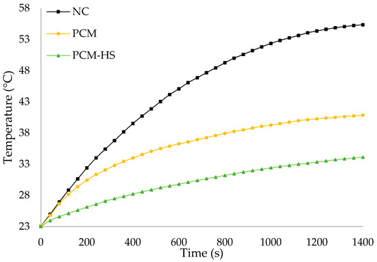 Comparison of the experiments for NC, pure PCM, and hybrid PCM-HS.