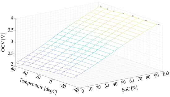 The developed semi-empirical 1D model was modeled in which the OCV model was based on a numerical method that the results are saved in LUTs. Figure 11 demonstrates the OCV map as function of SoC (between 0% to 100%) and temperature (−30, −10, 0, 10, 25, 40, 50, and 60 °C). The ohmic resistance values that were calculated utilizing the least-square fitting method are shown in Figure 12. The ohmic resistance map is a function of SoC (between 0% to 100%) and temperature (−30, −10, 0, 10, 25, 40, 50, and 60 °C) for the current rate of 150 A that is very high. The extracted parameters are stored in LUTs that are used to calculate the terminal voltage of the LiC.