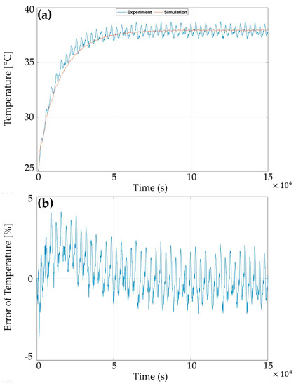The temperature error is essential to be as low as possible to simulate the temperature curve highly and to show the precision of the thermal model. In this regard, the temperature curve for the dynamic driving cycle is presented in Figure 14. The temperature of the climate chamber is set at various ranges to perform the experimental thermal test. Therefore, the condition should be considered the forced-flow or forced convection since a fan inside the climate chamber is responsible for controlling the temperature. In the figure, the simulation and experimental results for the temperature with an initial temperature of 24.6 °C as well as the error of temperature are exhibited. As can be seen, the error of temperature in the worst scenario (the highest current rate) is around ±4%, which shows the very high precision of the thermal model at the beginning of the simulation. After 5 × 104 s, where the cell’s temperature is at the steady-state zone, the error ranges below ±2%, which is perfect for such a high dynamic profile.