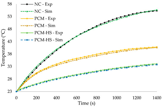 The 3D CFD model is simulated by setting all the initial and boundary conditions for the system. The precision of the simulations is evaluated by validation of the results with experiments. With respect to this, all the case studies, including NC, pure PCM, and the hybrid PCM-HS, are modeled and validated against the experimental results. Figure 15 demonstrates the validation results of these use cases. As is evident, the CFD simulations for all the use cases perfectly match the experimental results, showing the precision of the extracted electrical and thermal parameters linked to the accurate 3D CFD model.