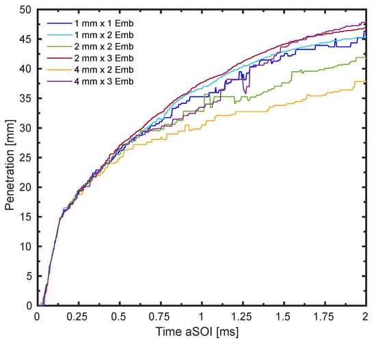 The evolution of the axial vapor phase penetration is shown in Figure 5. Initially, the model slightly overpredicts the vapor speed and penetrates with a steeper slope for the first milliseconds. The curve then seems to follow the experimental profile reasonably well and is capable of capturing the shape of the experimental curve. After the end of injection, the momentum of the spray seems to be lower than the experimental one where a slight deviation initiates and the numerical vapor penetrates with a slightly lower rate. Overall, it could be stated that the adopted turbulence model and Pope correction for the constant predict the air–fuel mixing process quite well and thus the spray evaporation rate. The issue with the underprediction after the end of injection (EOI) could be related to the adopted numerical cell resolution, in other words, refining the domain with an additional level of refinement could enhance the results considering a fixed spray model setup. However, a minimum value of was considered sufficient enough to provide a good compromise between simulation run time and accuracy.
