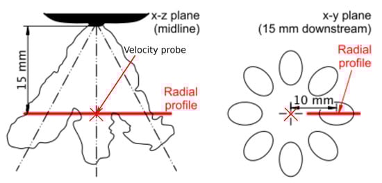 The PLV was numerically computed by integrating the Eulerian of the spray for different slices and projecting it on a two–dimensional plane. The liquid penetration was then deduced as the maximum axial position from the nozzle tip with a value below either of the thresholds. The axial gas velocity was computed by a probe point placed at 15 distance away from the injector tip location and was compared with Particle Image Velocimetry (PIV) measurements [35]. Finally, the radial Sauter Mean Diameter (SMD) distribution was computed along a line passing through one of the plumes at perpendicular plane 15 below the injector tip according to Figure 2 and was compared with experimental PDI measurements performed by GM [36].