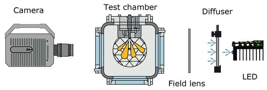 The high pressure fuel system is similar to that used for diesel injectors and has been previously described in [39]. More importantly, the spray visualization was based on two optical techniques: single–pass schlieren was used for the vapor phase and diffused back illumination (DBI) for the liquid phase. The latter setup is shown in Figure 3, where the main optical components can be depicted. A blue light emitting diode (LED) light source was placed on one side of the test chamber where an engineered diffuser with 100 diameter was used leading to a uniform light transmission. A Fresnal lens characterized by a focal length of 67 was utilized in order to reproduce the diffused light at the optical plane of interest. The Photron S9 camera acquisition speed was set to 30 and the spatial resolution was / with a field of view of 384 × 376 pixels.