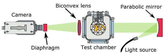 The schlieren setup consisted of point illumination light source coming from a 1 Mercury–Xenon arc lamp. A parabolic mirror is used to parallelize the rays before passing through the test vessel. After passing through the chamber, the rays are converged at the focal length ( 450 ) of a biconvex lens where a diaphragm, with 4 cutoff diameter, is placed right before the high speed camera to provide a highly contrasted image, as shown in Figure 4. The high speed Photron SA5 camera acquisition rate was set to 30 and had a field of view of 512 × 512 pixels. The spatial resolution for the Schlieren technique was /. More details regarding the experimental facility and optical techniques utilized for this study could be found in [40]. The main methodology for image processing is detailed in Payri et al. [38].