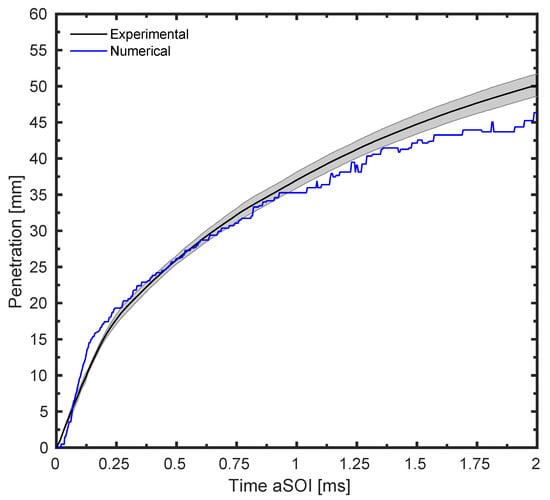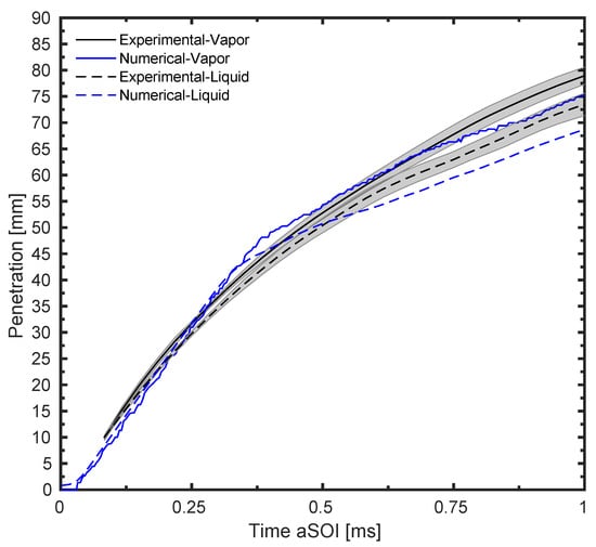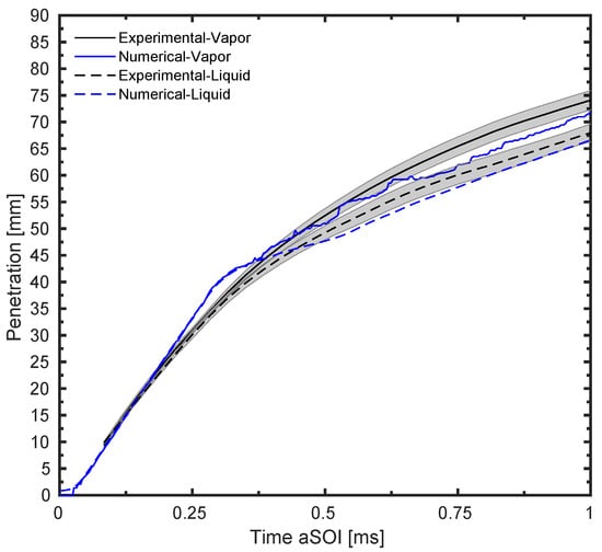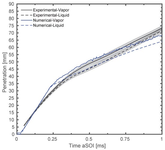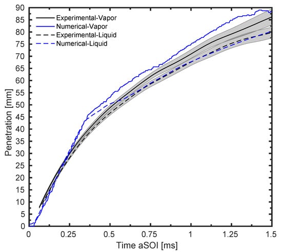 Numerical and experimental axial vapor phase penetration for the baseline condition (G1).