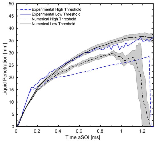 Numerical and experimental axial liquid phase penetration for the baseline condition (G1). High threshold corresponds to / while low threshold corresponds to / liquid volume fraction.