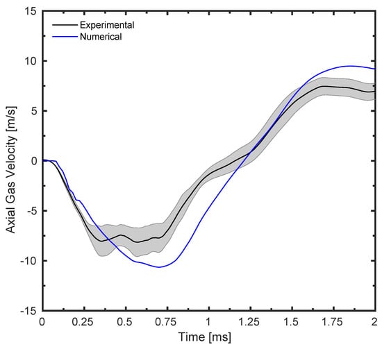 In order to accurately predict the mixture formation process, the spray induced gas velocity is of vital importance as it directly influences the spray evaporation rate. For this reason, the centerline axial gas velocity at 15 downstream of the injector is calculated and is shown in Figure 7. The magnitude of the axial velocity is highly dependent on the turbulence model adopted and the liquid core length, or in other words, the location at which the transition from primary atomization regime to secondary breakup occurs. The computed axial gas velocity presents an overestimation of the recirculating gas motion during the injection phase. This can be attributed to the prolonged liquid core length resulting in bigger droplets for a larger distance leading to a higher gas entrainment. Consequently, the reverse motion of the gas phase is delayed as seen by the gap after the end of injection, at , and then follows the experimental trend with good accuracy.