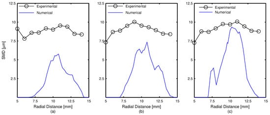 Numerical radial SMD profile comparison with experimental PDI data from GM for the baseline condition (G1). (a) , (b) and (c) .