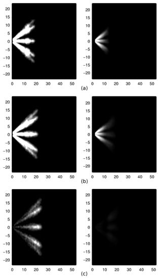where D is the droplet diameter taken as 7 according to Phase Doppler Interferometer (PDI) measurements provided by General Motors (GM) to the ECN and is the extinction cross–section acquired from MIE theory. It was assumed that the droplet diameter and extinction coefficient are constant along the light path. can be calculated using MiePlot [34] and is a function of the droplet diameter, light wavelength, and the collection angle of the optical setup. It was calculated to be for Spray G with iso–octane. The PLV indicates how much liquid volume is present in a certain projected area and thus has the units of (liquid)/ . Two different thresholds were used and recommended by ECN in order to reduce the uncertainties of the dependence on the chosen diameter value. Hence, a high and a low threshold were used according to Equations (15) and (16), respectively,