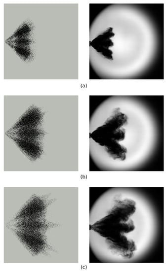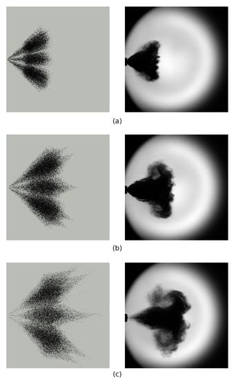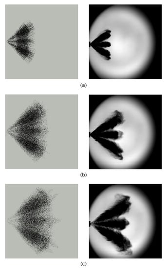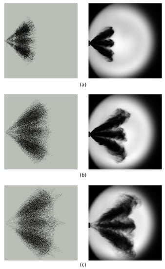 A more detailed explanation of the deviation shown in Figure 16 could be drawn from the spray morphology images shown in Figure 17. A large discrepancy between the numerical and experimental images can be clearly seen. At , the experimental spray is already collapsed towards the injector axis and evolves as a single entity. In addition, an initiation of the toroidal structure is seen at the spray radial extremities. This behavior is not reproduced by the numerical model where the plumes continue to penetrate in their original direction with minor plume–to–plume interactions. At , the toroidal structure becomes more evident and a higher degree of recirculating motion is shown at the two radial extremities of the spray. The tip of the numerical spray slightly changes and becomes narrower. Finally, after the end of injection at , the experimental spray penetrates faster due to the spray collapse. No spray collapse is evident in the numerical spray although a slight deviation of parcel direction at the spray tip can be noticed. The variation in the slopes of the liquid penetration curves between the numerical and experimental trends can then be justified by the spray images. The numerical model presents a drawback since the spray collapse is not predicted and therefore lags behind in terms of penetration. Duronio et al. [45] adjusted the plume direction and cone angle when moving towards more extreme case of flash boiling at an ambient density of / and using iso–octane. The plume direction was decreased down to 19, compared to the nominal 37, and it was possible to reproduce the spray collapse by doing so. Modifying the plume cone angle and plume direction produced a higher radial velocity component in the spray simulations leading to the classical bell shape of the jet with two recirculation zones on each side. However, for the sake of implementing a comprehensive model, the plume direction was not modified in this study and the plume cone angle reduction alone was not able to predict the spray collapse behavior seen in the experimental images.
