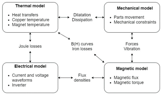 Coupled multiphysics modelling methods must be used to properly assess motor performance [9,10]. Indeed, there are many interactions between the physical phenomena in a machine and they must be considered as explained in [11]. Figure 1 shows the multiphysical couplings and the connection between them. However, the trade-off between the accuracy of these models and computational time is a critical factor when using an iterative optimization procedure that may require a significant number of iterations before converging to a solution [12].