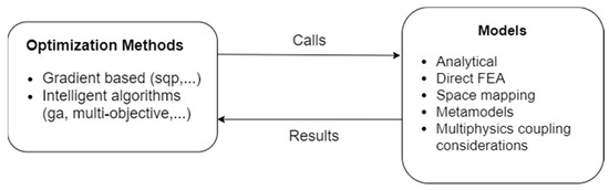 From Figure 2 can be observed that there are several iterative optimization methods that use FEA and/or analytical models, among these are analytical modelling, direct FEA modelling, space mapping [18] and metamodeling [19] for constraints and objective function evaluations.