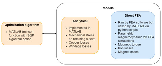 As it can be seen in Figure 3, the “fmincon” function of the MATLAB software with the “sqp” algorithm option is the main optimization algorithm. Analytical models for the stress on the retaining sleeve, the copper losses and the windage losses were also implemented in MATLAB. Moreover, a direct FEA coupled electromagnetic model was implemented on FLUX2D software, a parametric FEA software. FEA simulations were called from MATLAB and ran by the FEA software via python files.