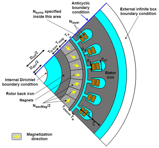 As it can be seen in Figure 4, boundary conditions must be specified. The internal Dirichlet condition is optional, but the external boundary condition is mandatory. To speed up the simulation, the study of the 2D geometrical domain was minimized to a portion the transversal plane. A cyclic or anti-cyclic boundary condition was added in the function of the number of poles in the studied domain. If the number of poles drawn is even, the periodicity must be cyclic. On the contrary, if the number of poles drawn is odd, the periodicity must be anti-cyclic.