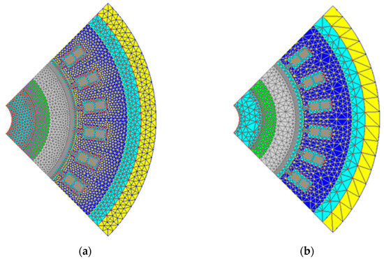 The choice of the number of nodes makes it possible to find a compromise between the computation time and the precision of the magnetodynamic simulations. It was found that the magnetic losses and electromagnetic torque computed with a mesh having 4124 nodes (Figure 5b) are very close (less than 0.05%) to those obtained with a mesh with 8595 nodes (Figure 5a). The main difference is on the computation time which is divided by two. Therefore, for the iterative optimization process, it is very advantageous to reduce the number of nodes and to use the mesh of Figure 5b.