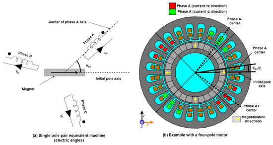The current waveforms are sinusoidal with an RMS value of Is and are forming a three-phase balanced circuit. As can be seen in Figure 6, θac is the electric angle between the rotor magnetic pole axis in its initial position and the magnetic axis of phase A. For example, the value of θac for the machine drawn on Figure 6 is 0.2618 rad or 15°.