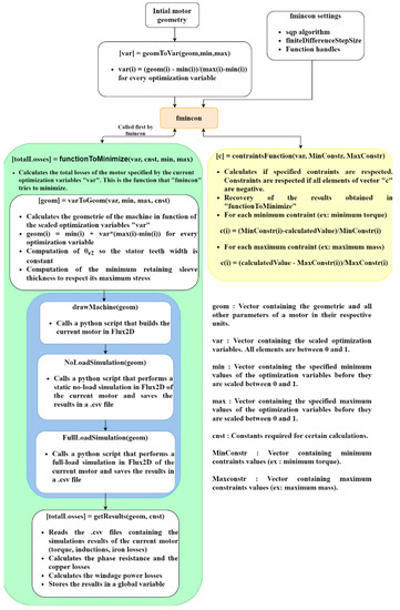 The motor geometry was optimized with the MATLAB function “fmincon” with the “sqp” algorithm. The function handles provided in parameters of “fmincon” started a Flux2D server that launches the python scripts which construct and simulate the motor with the finite element software. Optimization variables were scaled from 0 to 1 and the output of the constraint function was also manually scaled. The overall implementation in MATLAB is presented on Figure 7.