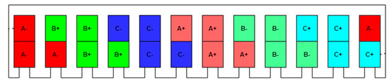 Since the machine structure is imposed with a number of slots per pole and per phase equal to two, the minimum study area for the finite element simulation is always one pole even when the number of poles changes. The configuration of the stator winding can also remain the same. A winding configuration with two layers and a short pitch of 5/6 was selected (Figure 8).