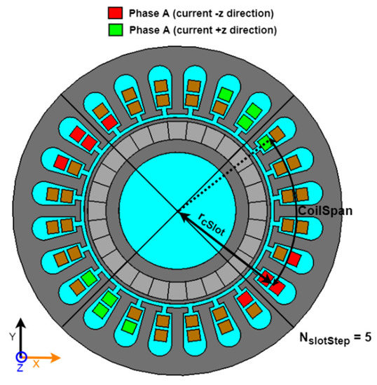 The average coil length (, as shown in Figure 9, was estimated considering that wires protrude by 1 cm on each side of the stator and that coil ends are 1.41 times longer than the coil span.