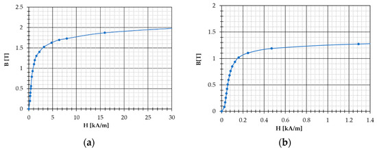 (a) Rotor back iron first magnetization curve. (b) Stator sheet first magnetization curve.
