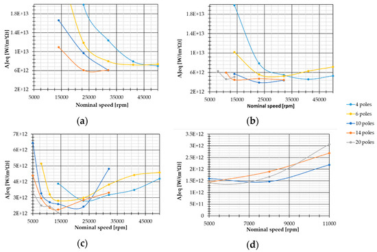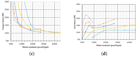 Optimization results were gathered to compare the performance of machines with the same power density. Thus, Figure 11a shows machines optimized for 30 kW/kg; those of Figure 11b, machines of 20 kW/kg; those of Figure 11c, machines of 10 kW/kg; and those of Figure 11d, machines of 5 kW/kg.