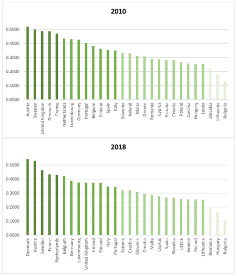 In 2018, the highest GEI was noted in Denmark (0.5415), and the lowest in Bulgaria (0.1038). In 2010, Denmark was in 4th place in the ranking of EU member states, while Austria achieved the best score (0.5194). As in 2018, Bulgaria ranked last in 2010 (0.1315).