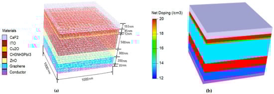 (a) Meshed structure (mode transparent), and (b) net doping concentration of the inverted planar PSC.