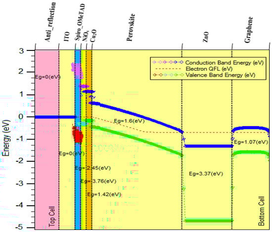 The difference in the energy state of different materials in the conduction and valence bands is depicted in Figure 3. Provided that the type of material varies from one layer to another and the electronegativity of each material is a constant value and independent of the amount of impurities, the areas differed in electronegativity, which resulted in discontinuity in the structure of the energy bar. As the Spiro-OMeTAD, Cu2O and NiOx areas have p-type impurities, their Fermi level alignment was close to the valence band, as also evident in Figure 3. The reason for the proximity of the Fermi level alignment to the conduction band in the fifth layer is that ZnO has n-type impurities. In effect, these findings confirm the accuracy of the simulated energy bar chart. Table 1 lists the electrical parameters used to simulate the inverted planar PSC.