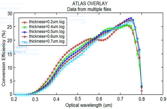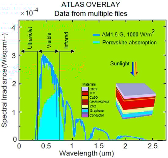Figure 8 shows the AM 1.5G spectrum, which is commonly referred to terrestrial-use solar cells undergoing non-concentrated sunlight spectrum measurements. The solar spectrum ranges widely from 250 to 2500 nm. The majority of the light absorption occurs on the absorption layer with a 1.6 eV bandgap and at a wavelength of 400 to 800 nm, which covers a large part of the visible range of light (indicated in the turquoise blue color). In addition, Figure 8 shows that the maximum absorption point in the turquoise blue region, at a wavelength of 750 nm, is important for this solar cell. According to Table 2, the best efficiency under conditions of a wavelength of 750 nm and a thickness of 500 nm is 28.064%.