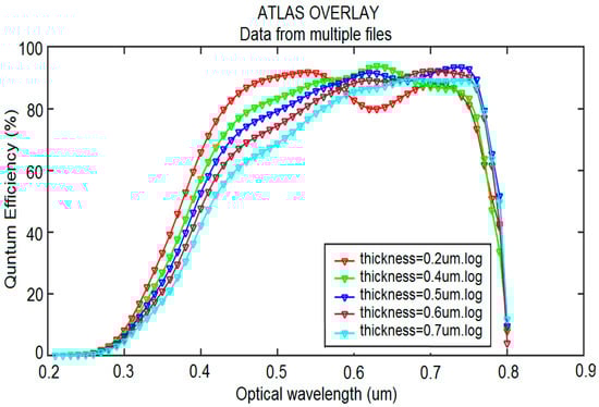 Figure 5 shows the external quantum efficiency (EQE). In the active area, any point with the highest absorption has the maximum value of EQE. The optimum thickness of the inverted planar PSCs was 500 nm, and a maximum EQE of 93.36% was obtained with this thickness. The simulation results are in good agreement with the experimental results presented in the existing studies. The simulation results reveal that the solar cells have the highest absorption capacity in the wavelength range of 450–750 nm, and the maximum value of EQE is obtained within this wavelength range. For the thickness of 500 nm, the maximum wavelength is estimated to be 750 nm. Ultimately, through the absorption of photons with a very low energy at a wavelength of over 750 nm, the absorption drastically decreases until it reaches a value of zero at a wavelength of 800 nm.