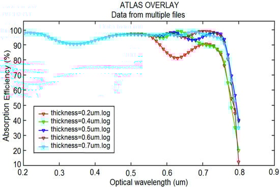 Figure 6 shows the photon absorption in the inverted planar PSC for the anti-reflective coating of CaF2. The lowest photon absorption was obtained for the perovskite layer with a thickness of 200 nm. The increased thickness of the absorbent layer increases the photon absorption at longer wavelengths. Therefore, a wider absorption range absorbs higher-energy photons in the ultraviolet region and emits fluorescence at wavelengths between 450 and 750 nm, where the quantum efficiency of the solar cell is higher. Finally, increased fluorescence intensity increases the short-circuit current density, followed by an improved efficiency in this solar cell.