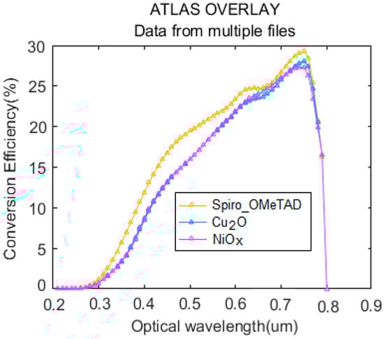However, after determining the highest efficiency for the Spiro-OMeTAD polymer composition, the highest efficiency and current density of inorganic materials Cu2O and NiOx are obtained. Therefore, inorganic materials can provide a successful path to achieve higher efficiencies for PSCs based on Cu2O or other inorganic transport materials, owing to their acceptable conductivity, simple methods of layer deposition, and high stability. Figure 7 and Table 3 show the results obtained for Spiro-OMeTAD, Cu2O, and NiOx. Consequently, the presence or absence of this layer has a significant effect on the overall efficiency of the solar cell.