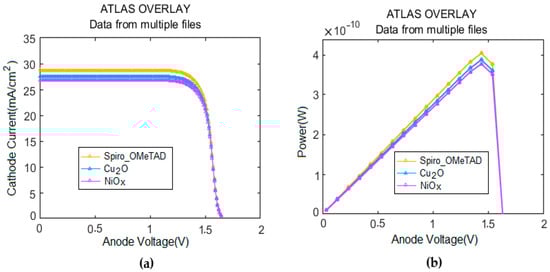 Recently, a wide range of minerals, such as HTM and ETM, has become increasingly prevalent in PSCs owing to their low manufacturing costs. However, only a handful of samples have been able to achieve a PCE of 25.05% [60,61,62,63]. There is no limit to the minerals that can be used in solar cells to reach efficiencies similar to those obtained using Spiro-OMeTAD as the hole transfer layer. Here, we studied the voltage and current properties of inverted flat PSCs with Spiro-OMeTAD organic and inorganic substances, including Cu2O and NiOx, used as HTM and inorganic substances, respectively, including using ZnO as ETM. The simulation results are presented in Figure 8, Figure 9 and Figure 10; the best I–V was obtained by using Spiro-OMeTAD for Cu2O, and finally for NiOx.